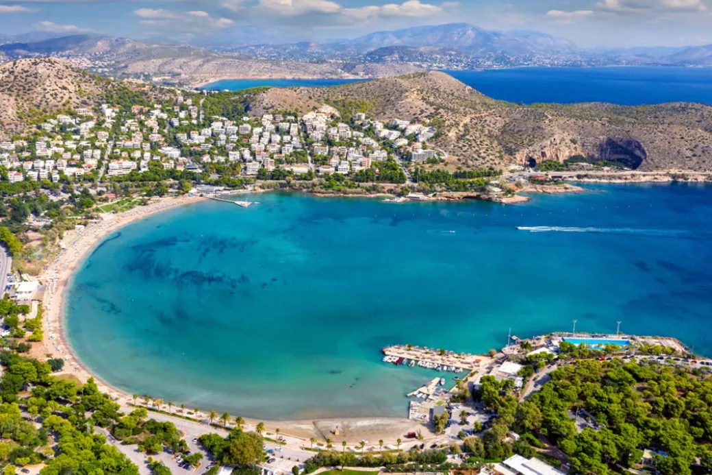 Vouliagmeni Beach in Athens, a Blue Flag-awarded spot, is a popular, well-organized sandy beach with pebbles, offering easy access by car or bus. It features lifeguards, sunbeds, beach bars, and various sports facilities.